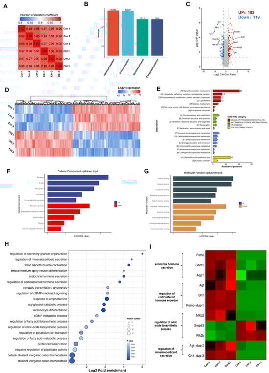 To investigate the impact of CIH on Kac changes in the hypothalamus, 3-week-old male C57BL/6J mice were subjected to a hyperbaric oxygen chamber for a period of 3 weeks to simulate CIH as they transitioned from adolescence to adulthood. To assess the impact of CIH on the hypothalamus at the molecular level, protein extractions from mouse hypothalamic tissue were conducted, followed by LC–MS analysis. We conducted three replications for each sample to ensure precision, and the PCC for Log2 LFQ intensity between replications was determined to be 1 (Figure 1A). Each identified protein was found to have at least one unique peptide. The total number of peptides and proteins that were identified after data filtering is displayed in Figure 1B. The length distribution of peptides that were identified by mass spectrometry met our stringent quality control criteria. In total, 7012 proteins were identified, 7002 of which were quantifiable. To identify differentially expressed proteins (DEPs), we established cut-offs for the foldchange (>1.5 or <0.667) and p value (<0.05). Proteins that did not meet these threshold parameters were excluded from further analysis. Among the DEPs, a total of 222 proteins exhibited significant modulation in the hypothalamus, with 103 up-regulated proteins and 119 down-regulated proteins (Figure 1C; Table S1). Heatmap analysis demonstrated that CIH induced substantial alterations in the overall proteome profile within the hypothalamus (Figure 1D). To gain insights into their functional roles, we performed Clusters of Orthologous Groups (COGs) analysis on these DEPs. Our COGs analysis demonstrated that among these DEPs, a group consisting of 153 proteins was associated with information storage and processing, cellular process and signalling, and metabolism; moreover, it was poorly characterized. Another group comprising 21 proteins was linked to metabolic pathways such as energy production and conversion, inorganic ion transport/metabolism, carbohydrate/lipid transport and metabolism, and amino acid transport and metabolism. Furthermore, among the information processes involving 21 proteins, the most prominent included RNA processing and modification, chromatin structure and dynamics translation, ribosomal structure and biogenesis, transcription and replication, and recombination and repair (Figure 1E, Table S2). To explore how CIH affects hypothalamic host functions, we conducted Gene Ontology (GO) enrichment analysis. This analysis demonstrated significant regulation of molecular functions (MFs) and cellular components (CCs), such as those depicted in Figure 1F,G (Tables S3 and S4), based on −Log10 (p values). The three most up-regulated CCs were synapses, Z discs, and actomyosin, whereas secretory granules, endoplasmic reticulum lumen and mitochondria were among the top down-regulated components (Figure 1F). As for MFs, the top three up-regulated functions included protein binding, catalytic activity, and dopamine binding, whereas peptidase inhibitor activity, enzyme binding, and sterol esterase activity were among the top down-regulated functions (Figure 1G). KEGG signalling pathway enrichment analysis of the identified proteins demonstrated that a majority of them are involved in divalent inorganic cation homeostasis, fatty acid metabolic process regulation, and protein tetramerization (Figure 1H and Table S5). Additionally, significantly decreased expression levels of certain proteins enriched in internal secretion pathways (including endocrine hormone secretion, regulation of corticosteroid hormone secretion, and regulation of mineralocorticoid secretion) within the hypothalamus of CIH mice were found to be associated with more favourable prognostic outcomes (log-rank test, p < 0.05), as depicted in Figure 1I. In summary, these results showed that CIH caused global proteomic changes in the hypothalamus; specifically, it caused significant down-regulation of proteins known to be involved in endocrine hormone secretion.