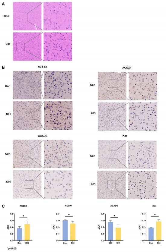 Expression changes of acetylation-related enzymes in the hypothalamus of CIH mice. (A) HE staining. (B,C) IHC staining was used to detect the protein expression of ACSS2, ACADS, ACOX1, and Kac. All experiments were repeated three times. All data are presented as the mean ± standard deviation. CIH: chronic intermittent hypoxia; IHC: immunohistochemistry; ACSS2: acetyl-CoA synthetase; ACADS: acyl-CoA dehydrogenase short chain; ACOX1: acyl-CoA oxidase; Kac: acetylated Lysine.