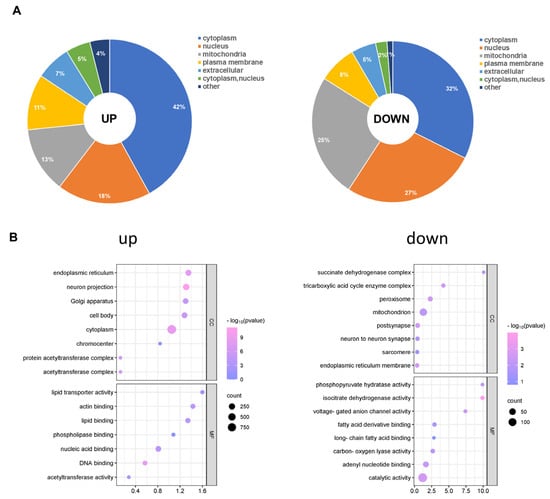 Subcellular distribution and GO analysis of acetylated proteins. (A) Subcellular distribution of up-regulated and down-regulated differentially acetylated proteins. (B) GO-CC and GO-MF analyses were performed for up-regulated and down-regulated differentially acetylated proteins. GO: Gene Ontology; CC: Cellular Component; MF: Molecular Function.