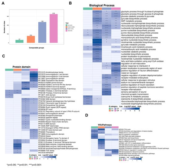 Functional analysis of acetylated proteins with foldchange. (A) Differential acetylation sites were divided into four groups according to foldchange; (B) WikiPathways analysis, (C) protein domain analysis, and (D) GO-BP analysis were performed for acetylated proteins with foldchange. GO: Gene Ontology; BP: Biological Process.