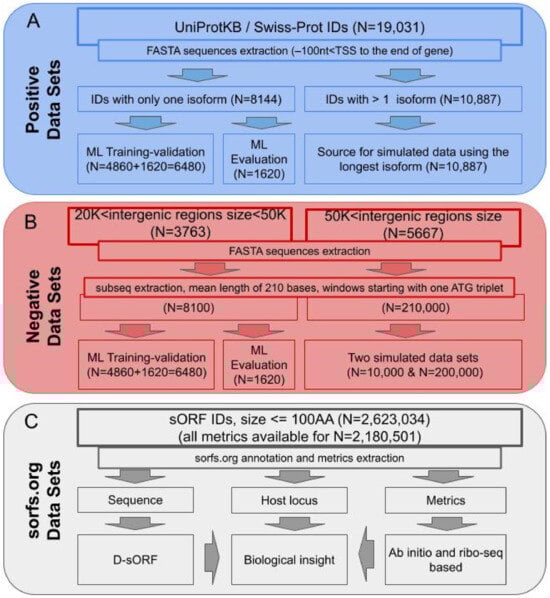 This initial dataset was split into two parts. The first part consisted of 8144 coding sequences with only one isoform in Swiss-Prot to avoid unnecessary complexity deriving from alternative start sites. This first part was retained for the machine-learning component of the algorithm. It was divided into two non-overlapping sets for training and testing, respectively (see Section 2.6). The second part of the initial dataset (i.e., the remaining 34,940 sequences) was used to construct a positive simulated sORF dataset, which corresponded to 10,887 genes with alternative isoforms, from which the longest isoform for each gene was selected as the source sequence (for simplicity).