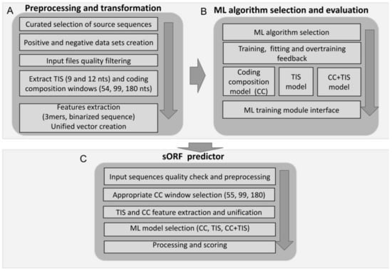 Workflow of the D-sORF Framework. (A) In the “preprocessing and transformation” module, the input sequence datasets were cleared from ambiguous and low-quality sequences and sequence windows for the TIS and CC (coding composition) were separated for feature extraction. A vector was created for all the CC and TIS features individually as well as from the unification of the corresponding TIS and CC features. These vectors were the drivers of the training process. (B) In the “ML algorithm selection and evaluation” module, comparison and selection between well-known ML algorithms (e.g., SVM, RF) took place. For each feature vector (CC, TIS and combined CC with TIS), a separate output model was trained to be used from the D-sORF main module (predictor). (C) The D-sORF predictor was fed with sORFs for processing. The best fitting window among 55, 99, and 180 was selected based on the sORF length. The user could select which model to apply (CC, TIS or combinatory CC+TIS mode) The Diana-sORF returns a score in the range [0 to 1]. Higher scoring values provide the sORF with a greater chance of being coding.