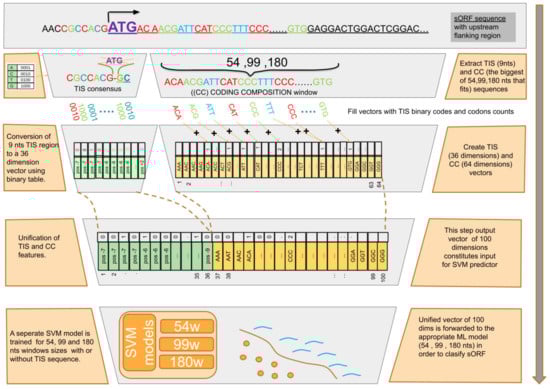 To capture the coding composition (CC) of a given sORF, three different sequence length CC windows of 54 nts, 99 nts, and 180 nts were extracted downstream of the first +90 nts until the corresponding stop codon. The first 90 nts were omitted from training and testing to avoid plausible signal peptides known to precede the protein-specific nucleotide context [61]. Signal peptides have a very specific amino acid composition [2] and can produce a negative bias during the training procedure. All the windows were extracted on a 3-step basis to maintain the in-frame information. Subsequently, a 64-element vector was created containing the frequency of each of the 64 different 3-mers. Finally, the TIS and CC-derived vectors were unified.