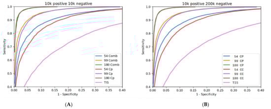 D-sORF ROC curves. Sensitivity vs. specificity diagrams following integration of the TIS and CC features into a unified coding potential (CP) feature. The diagrams depict the framework performance after the integration of the TIS in 54, 99, and 180 nts CC window mode (A) for balance data, and (B) for imbalanced data.