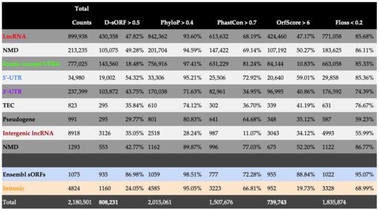 Genome-wide application of D-sORF to classify experimentally validated sORFs as coding. The table contains all the sORFs from the sorfs.org database and shows the absolute count and percentage of sORFs classified as positive by D-sORF, PhyloP, PhastCon, ORFscore, and FLOSS at their corresponding cut-off values. The sORFs have been annotated based on sorfs.org classification parameters as exonic (sORFs located in the exonic part of a gene), intronic (sORFs located partially or completely overlapping introns), intergenic (sORFs in lncRNAs at distal sites > 5000 bp), lncRNA (sORFs overlapping long non-coding RNAs), 3′ UTR (sORFs in 3′-UTR regions of genes), 5′ UTR (sORFs in 5′-UTR regions of genes), Ensembl sORF (sORFs corresponding to Ensembl ID protein-coding ORFs of fewer or equal to 100 AA), NMD (classified as nonsense-mediated decay if sORF overlaps the coding sequence of a transcript that finishes >50 bp from a downstream splice site) and TEC (to be experimentally confirmed as protein-coding, overlapping EST clusters that have polyA features). The colors associated with each sORF class indicate the genomic region from which they originate, as illustrated in Supplementary Figure S3.