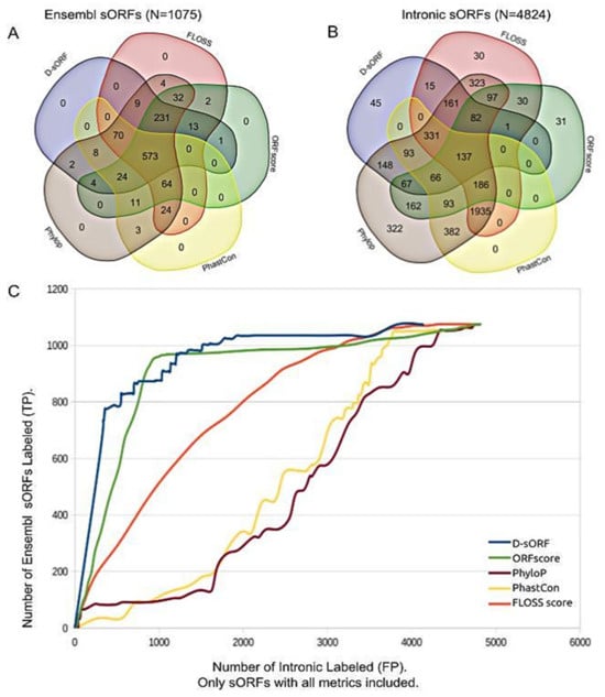 To gain more insight, 1075 Ensembl sORFs and 4848 intronic sORFs with prediction scores by all the metrics were plotted in Venn diagrams. In the Ensembl sORF positive group, significant overlapping of common positive sORFs was observed (573/1075 ~54%) for all the metrics and (804 ~75%) for D-sORF, ORFscore, and FLOSS combined (Figure 6A). On the contrary, in the intronic category, slight overlapping of common positive sORFs (137/4824 ~3%) was observed (Figure 6B). It remains to be investigated whether the above small percentage of intronic sORFs that were detected as positive by all the metrics and by D-sORF, ORFscore, and FLOSS score combined could represent a subset of circular RNA transcripts that translate microproteins with significant biological roles in human diseases [66].