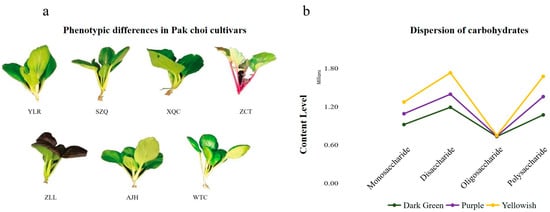 Phenotypic differences and carbohydrates classification in Pak choi cultivars (a) where YLR—Yellowrose, SZQ—Suzhouqing, XQC—Xiangqingcai, ZCT—Zicaitai, ZLL—Ziluolan, AJH—Aijiaohuang and WTC—Wutacai. (b) Division of carbohydrates based on leaf color.