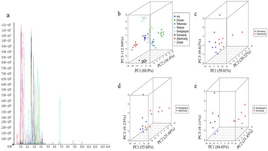 Detection and representation of metabolites. (a) The multi-peak plot of MRM detected metabolites, (b) principal component analysis (PCA) showed the metabolic profiling of all replicates, (c) PCA of SZQ and AJH, (d) PCA of XQC and AJH, and (e) PCA of XQC and SZQ.