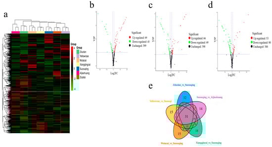 The demonstration of the relationship between groups of differential metabolites is omitted here. A total of 115 metabolites are typical and found in all the cultivars used for the study (Figure 3e). The profiling of these groups shows that YLR and SZQ have 15, ZLL and SZQ have 32, SZQ and AJH have 15, ZLL and SZQ have 32, SZQ and AJH have 14, and WTC and SZQ have 15.