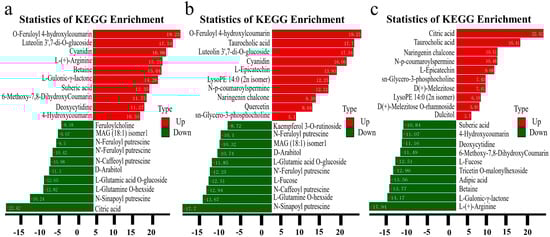 Following the descriptive analysis of the identified metabolites, a comparison was made regarding alteration in the multiplier of the metabolite quantification information across each group, considering the grouping of the specific sample. As shown in Figure 4, the FC of SZQ and AJH was 19.23 (Figure 4a), while XQC and AJH exhibited an FC value of 16.73 (Figure 4b). At the same time, the highest FC was found in XQC and SZQ with a value of 22.42 (Figure 4c).