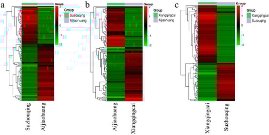 Clustering of differentially expressed metabolites in a combination of different cultivars of NHCC, including (a) SZQ and AJH, (b) XQC and AJH, and (c) XQC and SZQ.