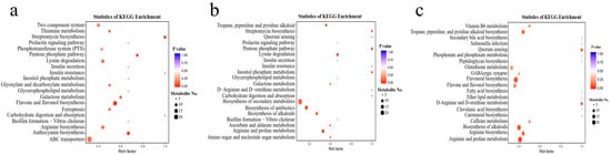 KEGG annotations and enrichment of differentially expressed upregulated metabolites where (a) SZQ and AJH, (b) XQC and SZQ, and (c) XQC and SZQ. Abscissa represents the quantification of metabolites, while ordinate shows the KEGG metabolic pathway found in the specific division as per order. Note: The rich factor is the ratio of the differentially expressed metabolites in the corresponding pathway to the total number of metabolites detected by the pathway. The higher the value, the greater the degree of enrichment. The closer the p-value is to 0, the more significant the enrichment. The size of the mid-point represents the number of metabolites enriched into the corresponding pathway with significant differences.