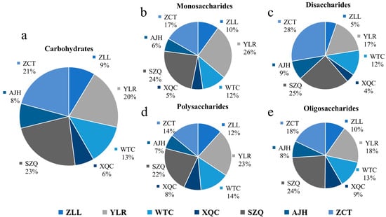 Differentiation of carbohydrates and subclasses in each cultivar of Pak choi based on the number of compounds against (a) total carbohydrates, (b) monosaccharides, (c) disaccharides, (d) polysaccharides (e) oligosaccharides.