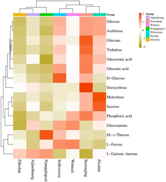 The three metabolites of carbohydrates belonging to this category, i.e., disaccharides, were found abundant in ZCT, while the lowest were in XQC, contributing 48% of the total carbohydrates in all the cultivars. In this classification, the most contributing compound is D-(+)-Sucrose, while the least was D (+)-Melezitose-O-rhamnoside (Figure 7c). Only two compounds of polysaccharides, including D-(+)-Glucono-1,5-lactone and Glucarate-O-Phosphoric acid, constitute 30% of the total carbohydrates. Most of the polysaccharides were found in cultivars in YLR, which was followed by SZQ and ZCT, respectively (Figure 7d). Oligosaccharides were minimal, with a maximum contribution from the cultivar SZQ and the lowest from AJH (Figure 7e). The common compound of carbohydrates found in the KEGG enrichment (Figure 6) was D-(+)-Glucose (C00031). Different expression levels of DAMs are shown in Figure 8. The heatmap shows that the Aijiaohuang cultivar has a high abundance of glucose, while the Xiangqingcai cultivar has a low abundance of glucose.