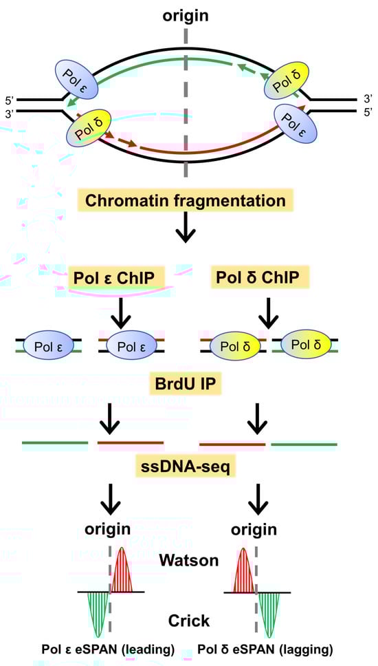 The molecular mechanisms of DNA replication have been studied using various techniques, including gradient centrifugation, two-dimensional gel electrophoresis, electron microscopy, chromatin immunoprecipitation, fluorescence microscopy, and DNA fiber analysis [,,]. Detecting the replication strand preference of histones is imperative to addressing the questions noted above. However, determining whether a protein is located on the leading or lagging strand of replicating DNA using standard biochemical methods is challenging. We developed a new method called eSPAN (enrichment and sequencing of protein-associated nascent DNA) [] to allow us to distinguish proteins bound to the leading and lagging strands of newly synthesized DNA (Figure 1). In eSPAN, nascent DNA is first labeled with BrdU or EdU (5-ethynyl-2′-deoxyuridine). A replication-associated protein or modification is then subjected to ChIP. The protein-associated new DNA is isolated by BrdU IP and sequenced using a strand-distinguishing library preparation method. Using eSPAN, we have confirmed the strand preference of several key proteins, including Pol δ, Pol ε, DNA ligase, and MCM2-7 helicase. We have also found that the DNA replication clamp PCNA prefers the lagging strand under normal conditions but is specifically unloaded from the lagging strand in response to replication stress. Thus, eSPAN enables, for the first time, rigorous genome-wide analysis of replication-coupled deposition of preexisting nucleosomes onto leading and lagging strands [,]. Additionally, with eSPAN or a similar method known as SCAR-seq (sister chromatids after replication by DNA sequencing), several key regulators in epigenetic inheritance, including Mcm2, have been identified [,,].
