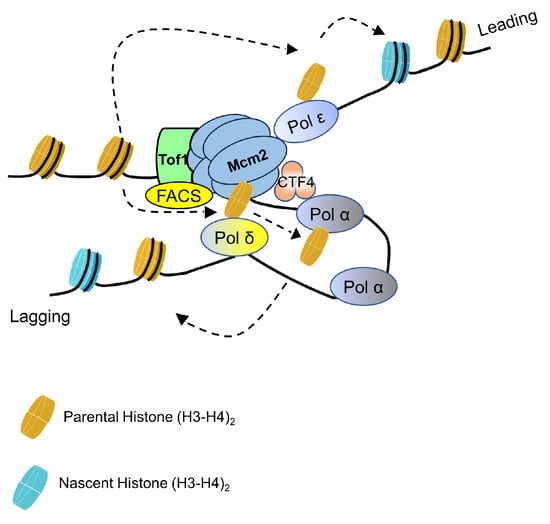 Recently, the DNA polymerase δ subunit Pol32 was identified as being involved in the transfer of parental histones to the lagging strand (Figure 2), functioning downstream of Mcm2 [,]. Pol32 can bind directly with Mcm2, and their interaction is independent of Ctf4 []. Since the MCM2-7 helicase is located at the front of the replisome, Mcm2 is likely the first and key parental histone chaperone. Supporting this notion, parH3:H4tet, once disassembled from the parental chromatin bound to Mcm2, is then transferred from Mcm2 to Pol32, and subsequently via Pol1 to the lagging strand [,]. While Ctf4 supports Pol32 in the transfer of parental histones, further experiments are needed to elucidate the detailed pathways of this transfer process [].