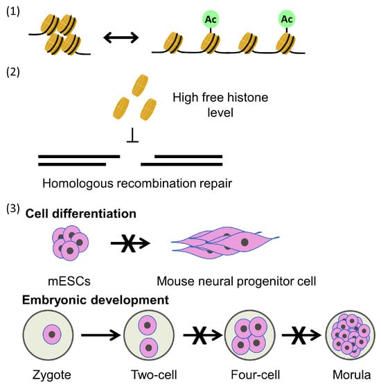 Consequences of parental histone defects: (1) changes in chromatin structure and gene expression patterns; (2) defects of parental histone transfer leading to high levels of cell-free histones, which can inhibit homologous recombination; and (3) defects of parental histone transfer can lead to defects in mESC differentiation and development of mouse embryonic defects.