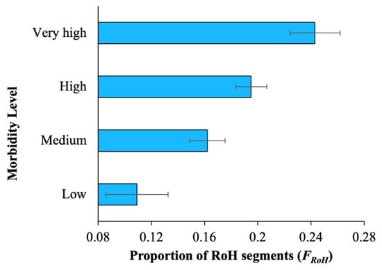 To assess the health of the dog breeds, we measured the level of morbidity in terms of DYAR (see Section 2 for details). First, the whole-genome diversity was estimated for each breed and plotted against morbidity, and a highly significant negative relationship (r = −0.42, p = 0.0009) was observed between the two variables, suggesting that the breeds with low diversity had a high morbidity score (Table 1). For instance, the heterozygosity of the genomes of breeds with low morbidity was ~0.001, whereas it was 0.0007 for breeds with very high morbidity, and the difference between them was highly significant (p = 0.00002, Z test) (Supplementary Table S3). Next, we estimated the proportion of genome under runs of homozygosity (FRoH) for breed dogs and averaged them for each dog breed (Supplementary Tables S4 and S5). The regression analysis between FRoH and the level of morbidity showed a highly significant positive correlation (r = 0.45, p = 0.0002) (Table 1). While FRoH was 24% of the genomes of the breeds with very high morbidity, it was only 10% of the genomes of the breeds with low morbidity (Figure 1).