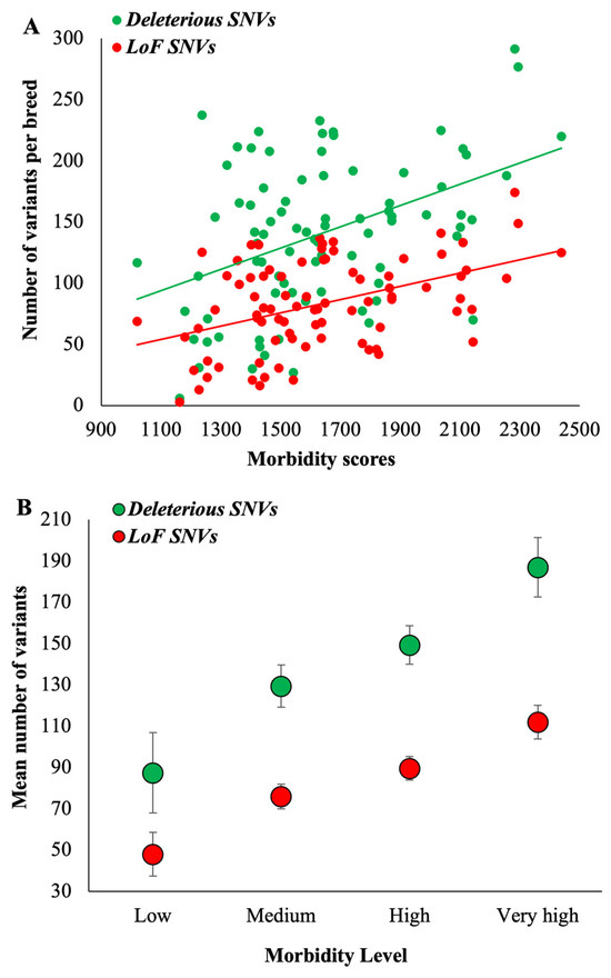 (A) Correlation between morbidity scores (number of VCEs/DYAR) and the number of homozygous deleterious or loss-of-function SNVs (located within RoH segments) per dog breed. The relationships are highly significant (p < 0.0006) (see Table 1). (B) The mean number of homozygous deleterious or loss-of-function SNVs (within RoH) was estimated for the dog breeds belonging to four morbidity groups. The error bars show the standard error of the mean.