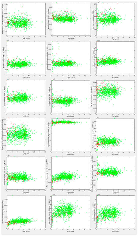 Scatter plots of the leading findings presented in Table 4 and Table 5, representing surface area abnormalities identified in DS as a percentage of total brain surface area (%TBSA). Green samples represent neurotypical participants, red samples represent DS participants. X represents a male, O a female.