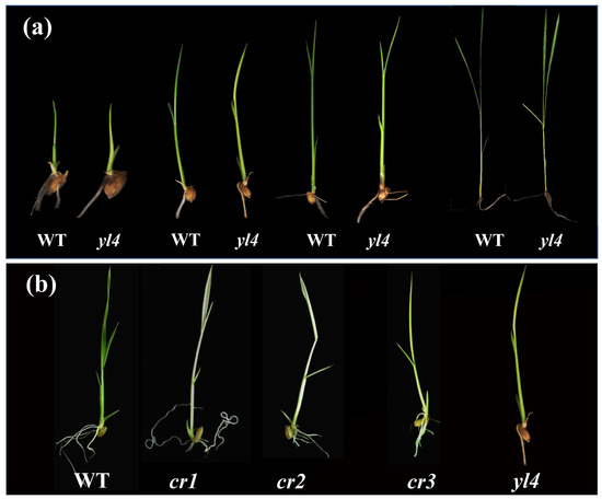 Phenotypic observation of the yl4 mutant: (a) one-, two-, three- and four-leaf-stage seedlings of wild type (WT) and yl4 mutant; (b) comparison of WT plants, yl4 mutant, and gene-edited seedlings (cr1–3).