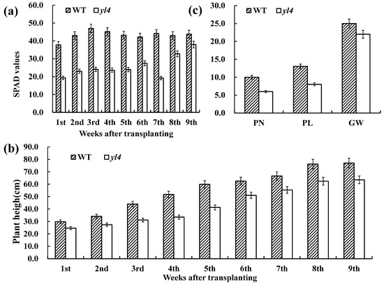 Characterization of the yl4 mutants: (a) leaf chlorophyll SPAD during the whole vegetative growth period after transplanting; (b) plant height during the whole vegetative growth period after transplanting; (c) panicle-related traits between yl4 mutant and WT plants. PN, panicle number; PL, panicle length (cm); GW, 1000-grain weight (g). Error bars represent SD (n = 3).