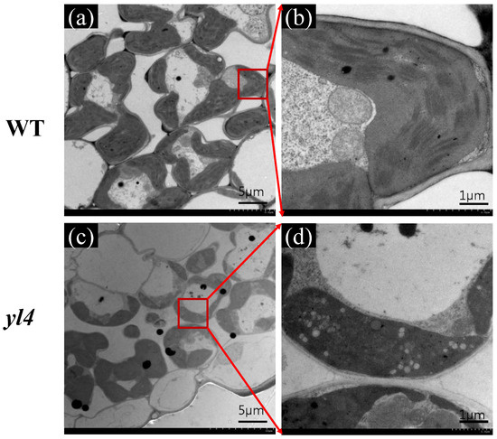 Transmission electron microscopic images of chloroplasts in WT and yl4 mutant of the 3-leaf stage: (a,b) chloroplast structure in WT; (c,d) chloroplast structure in yl4. The red arrow indicates the enlarged image in the red box.