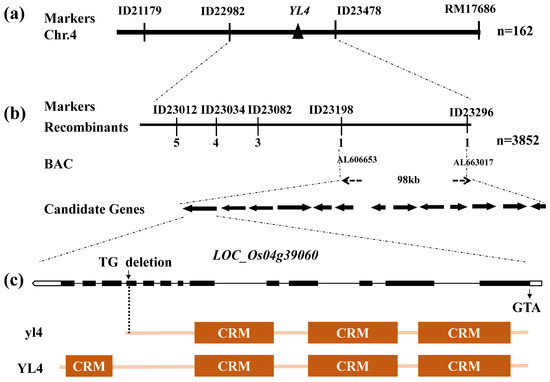 Map-based cloning of YL4: (a) the YL4 gene was initially located on chromosome 4; (b) YL4 was narrowed to 98 kb; (c) location of the deletion (TG) and CRM domains in yl4 mutants.