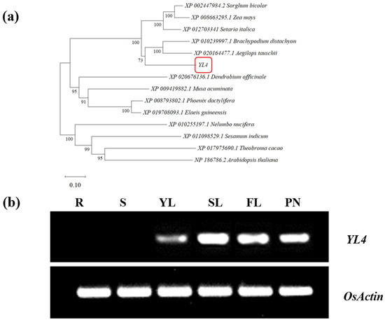 Phylogenic tree of YL4 protein and expression pattern of YL4: (a) phylogenic tree of YL4 and homologs. The red box represents YL4; (b) expression pattern of YL4. R, root; S, stem; YL, young leaf; SL, second leaf; FL, flag leaf; PN, panicle.