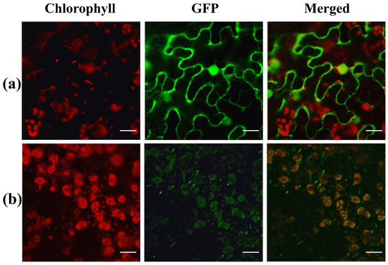 Subcellular localization of YL4 protein: (a) empty GFP vector without a specific targeting sequence; (b) YL4-GFP fusion. The scale bar represents 20 μm.