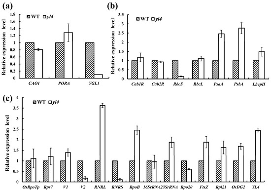To determine the impact of the YL4 mutation on the transcription levels of genes for Chl biosynthesis, photosynthesis, and chloroplast development, we investigated the transcription levels of 23 known related genes and YL4 (Figure 7). Resultantly, an obvious decrease in YGL1 was observed; however, there was a slight change in Chl synthesis CAO1 [26] and PORA [27] in the yl4 mutant (Figure 7a). Among the seven photosynthesis-related genes (Figure 7b), RbcS [28] were severely inhibited, and PsaA and PsbA [29] were all significantly up-regulated in the yl4 mutant. Moreover, with regard to the expression of chloroplast development-associated genes, V1 [30], RNRL(V3) [31], RpoB [32], 23SrRNA [33], FtsZ [34], and RPL21 were obviously up-regulated, while V2 [35] and RNRS were considerably down-regulated (Figure 7c). In addition, we found that the expression level of YL4 was significantly up-regulated in the yl4 mutant. In conclusion, the altered expression patterns of chlorophyll biosynthesis and chloroplast biogenesis genes may contribute to the yellow-leaf phenotype in the yl4 mutant.