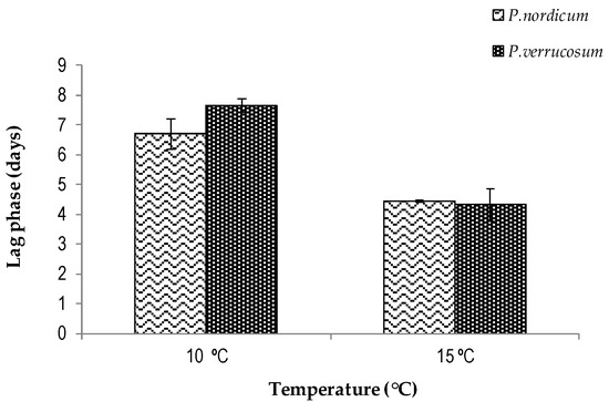 Figure 2 compares the lag phases prior to growth for the two species examined. Overall, they were shorter at 15 °C than at 10 °C (p ≤ 0.05) for both species. However, there were no significant differences at each steady-state temperature. There are no previous data on the lag phases for these two species on cheese analogues.