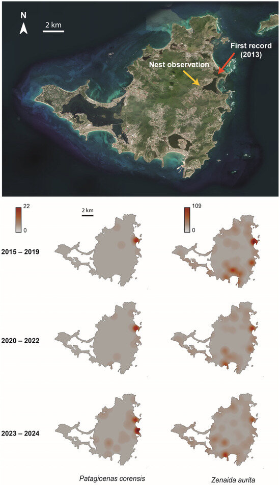 From eBird, we retrieved 108 and 2043 independent observations of the Bare-eyed Pigeon and the Zenaida Dove, respectively, for the 2013–2024 period. Figure 1 shows the spatial distribution of observations of the two species reported in eBird for the three considered time periods (i.e., 2015–2019, 2020–2022, and 2023–2024), with the invasive species most often co-occurring with the native species.