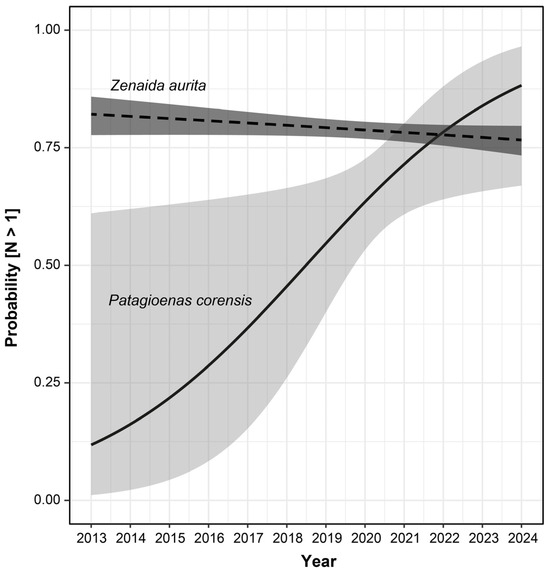 Variation in the probability of detecting more than one individual on each observation reported in eBird for Patagioenas corensis and Zenaida aurita between 2013 and 2024. The lines represent the predictive trends for each species according to model A (Table 1), with 95% confidence intervals indicated by grey ribbons around the lines (light grey: P. corensis, dark grey: Z. aurita).