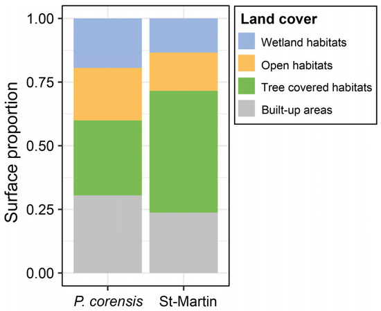 Proportion of habitat types around observation points of the Bare-eyed Pigeon reported on eBird.org and for the entire island of Saint-Martin.