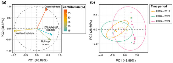 Plots showing the ACP results. Plot (a) displays the contributions of the four land cover types to the first two principal components (PC1 and PC2), explaining 48.89% (PC1) and 28.66% (PC2) of the total variance. See Appendix A, i.e., Table A1, for the factor loadings of the four types of land cover on the PC1 and PC2. The color gradient represents the magnitude of contribution from each land cover type, with red indicating higher contributions and green indicating lower contributions. Plot (b) shows the distribution of eBird observations along PC1 and PC2 for different time periods. Ellipses give a visual indication of the spread and central tendency for each time period, with a confidence level of 95%.