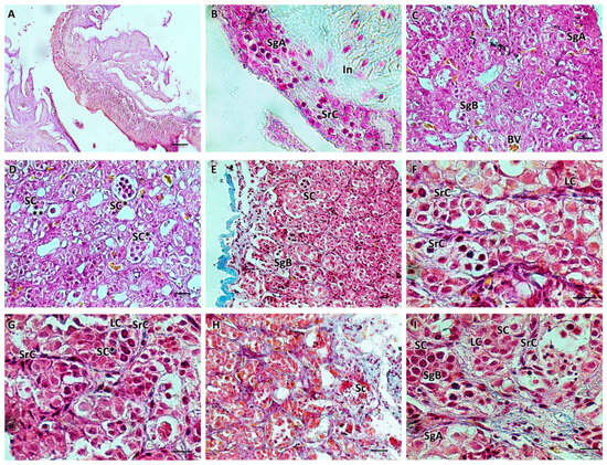 (A,B) Immature testis (M1), Mallory trichrome. The testis is composed of germinal and interstitial tissue. Spermatogonia and scattered Sertoli cells are visible. (C–I) Testis in early developing stage (M2), Mallory trichrome. Connectivity decreases, the number of spermatogonia A increases, and spermatogonia B appears with more densely stained nuclei. Juvenile spermatocysts containing 2 to 4 cells are visible. Some cysts appear at a more advanced stage of development with more than 4 cells (*). Sertoli cells surrounding the cysts are scattered; roughly polygonal Leydig cells are evident. B-spermatogonia (**). Primary and secondary spermatocytes begin to form. The organ appears to be rich in blood vessels. Legend: In = interstitium; SgA = spermatogonia A; SgB = spermatogonia B; SrC = Sertoli cells; LC = Leydig cells; Sc = spermatocytes; SC = sperm cysts; and BV = blood vessels. Magnification and scale bars: (A,E) 20×, 40 µm; (B–D,H) 40×, 20 µm; (F,G,I) 100×, 10 µm.