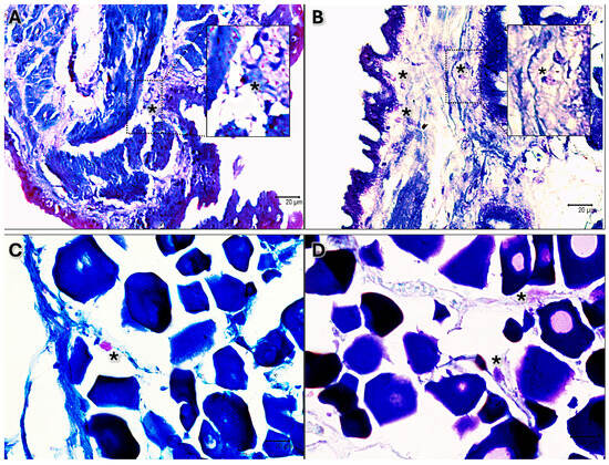 May–Grünwald Giemsa-stained sections 40×. (A) Immature testis. (B) Testis in early development. (C) Immature ovary. (D) Ovary in early development. Scattered immune cells are evident as pink-purple or blue in each stage of maturation of both male and female black scorpionfish gonads (*).