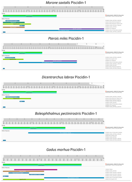 Our in silico analyses of Piscidin-1 revealed the presence of a Piscidin-1 protein ortholog in a close relative of the black scorpionfish, consisting of a 108 aa protein precursor. Moreover, the functional annotation analysis found the pleurocidin domain (IPR012515) characteristic of piscidins across all of the investigated teleost (Figure 4).