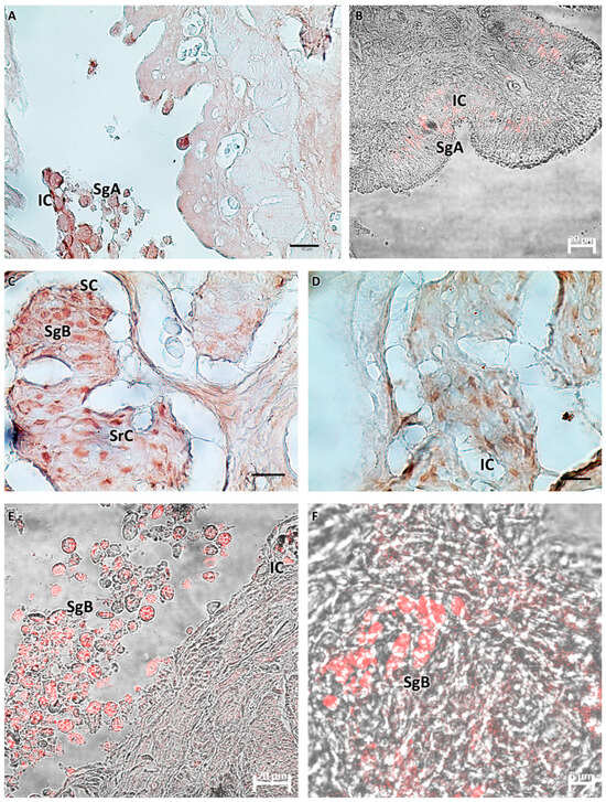 (A,B) Immature testis (M1), immunoperoxidase, and immunofluorescence. There is weak immunoreactivity of germ cells to Piscidin-1, especially spermatogonia A. There are a few scattered reactive immune cells. (C–F) Testis in early maturation (M2), immunoperoxidase and immunofluorescence. Spermatogonia B and spermatocytes appear positive for Piscidin-1, as do some Sertoli cells. Scattered immune cells appear strongly reactive to the antibody tested. Legend: SgA = spermatogonia A; SgB = spermatogonia B; SrC = Sertoli cells; SC = sperm cysts; and IC = immune cells.