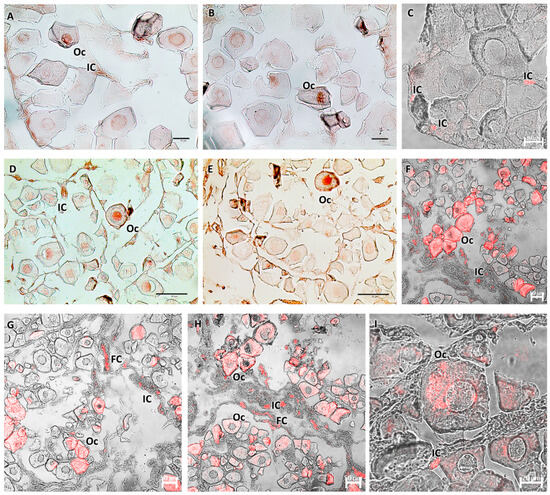 (A–C) Immature ovary (F1), immunoperoxidase, and immunofluorescence. Bland-positive oocytes and immune cells reactive to Piscidin-1 are visible. (D–I) Ovary in early developing stage (F2), immunoperoxidase and immunofluorescence. There is a more pronounced oocyte response to Piscidin-1, with reactivity involving the entire cell. Clearly visible and strongly labeled immune and follicular cells appear. Legend: Oc = oocytes; IC = immune cells; and FC = follicular cells.