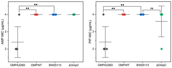 MIC values of E. coli strains. OMPA226D (black), E. coli OMPA226D; OMPWT (red), E. coli OMPWT; BW25113 (blue), E. coli BW25113. ∆OmpC (green), E. coli BW25113 ∆ompC. **, p < 0.01; ns, no statistical difference. Five parallels were performed in each group. The horizontal lines represent the average MIC value, vertical lines represent the SDs of the MIC averages.