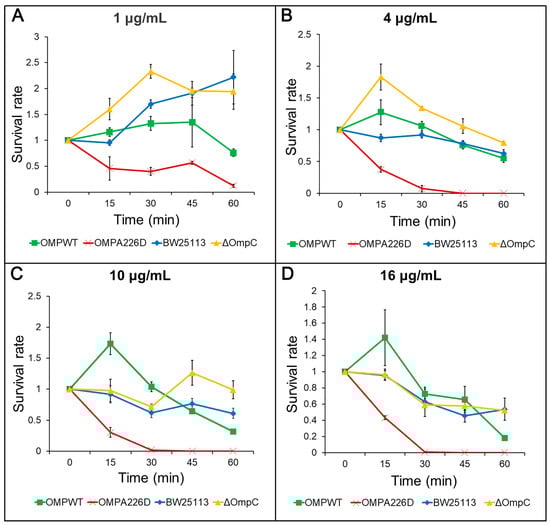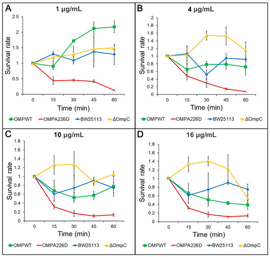 Survival assays for AMP. OMPA226D, E. coli OMPA226D; OMPWT, E. coli OMPWT; BW25113, E. coli BW25113. ∆OmpC, E. coli BW25113 ∆ompC. Error bars indicate standard deviations. Survival rate is the ratio of CFU numbers of the measured time point to time zero. (A), 1 μg/mL AMP; (B), 4 μg/mL AMP; (C), 10 μg/mL AMP; (D), 16 μg/mL AMP.