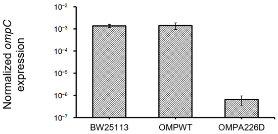 Expression ompC levels in all strains. OMPA226D, E. coli OMPA226D; OMPWT, E. coli OMPWT; BW25113, E. coli BW25113. Error bars indicate standard deviations. Expression levels were normalized with 16S rDNA levels.