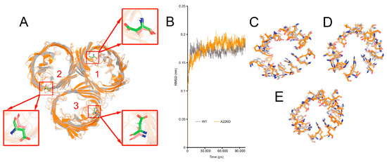 Simulated structures of OmpC wildtype and A226D proteins. Panel (A), alignment of wildtype and A226D OmpC proteins, numbers indicate the pore number. Panel (B), RMSD curves of the simulation. WT, OmpC; A226D, OmpCA226D. Panel (C), alignment of key residues in tunnel of pore 1. Panel (D), alignment of key residues in tunnel of pore 2. Panel (E), alignment of key residues in tunnel of pore 3. Gray color indicates wildtype OmpC. Orange color indicates OmpCA226D mutant.