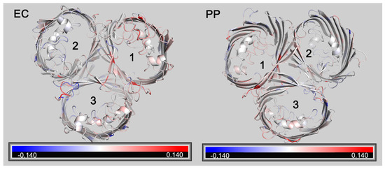 Changes of RMSF following A226D mutation. Red color indicates increased RMSF (in nm). Blue color indicates decreased RMSF (in nm). EC, view from the extracellular side. PP, view from the periplasmic side. The numbers 1,2, 3 represent pore 1, pore 2, and pore 3.