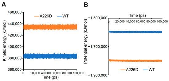Calculation of kinetic and potential energies in the system led to consistent conclusions. A226D mutation led to increased kinetic energy, suggesting improved flexibility and movement (Figure 7A). On the other hand, A226D mutation led to decreased potential energy, suggesting decreased interactions that accompany increased flexibility.