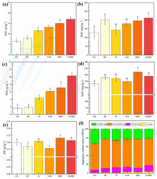 Mean contents of soil organic carbon (SOC) (a), dissolved organic carbon (DOC) (b), particulate organic carbon (POC) (c), KMnO4-oxidized organic carbon (EOC) (d), soil inorganic carbon (SIC) (e), and aggregate content ration (f) in the different treatments. Different letters indicate significant differences between the treatments and control (p < 0.05). CK: control; BC: Bacillus clausii; B: biochar; FeB: Fe-modified biochar; BBC: biochar combined with Bacillus clausii; FeBBC: Fe-modified biochar combined with Bacillus clausii.