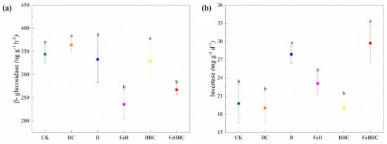 Among all the treatment groups, the FeB and FeBBC treatments exhibited lower levels of β-glucosidase (Figure 2a). Similar trends were observed in terms of invertase activity among all treatments. The B and FeBBC treatments displayed higher levels of invertase activity, while no significant differences were observed between the other treatment groups (Figure 2b).