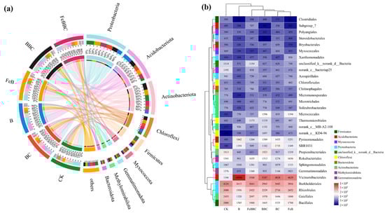 The relative abundance (a) of dominant species of bacterial communities. Heatmap diagram (b) of the dominant 30 bacterial orders in different treatments. CK: control; BC: Bacillus clausii; B: biochar; FeB: Fe-modified biochar; BBC: biochar combined with Bacillus clausii; FeBBC: Fe-modified biochar combined with Bacillus clausii.